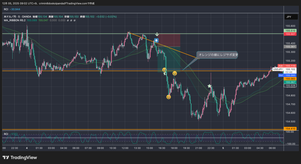 最後の利確だけ、ルール通りじゃなかったですね。売りエントリーなので直近の高値に設定すべきなので、離れすぎていたので。