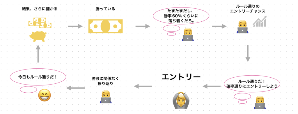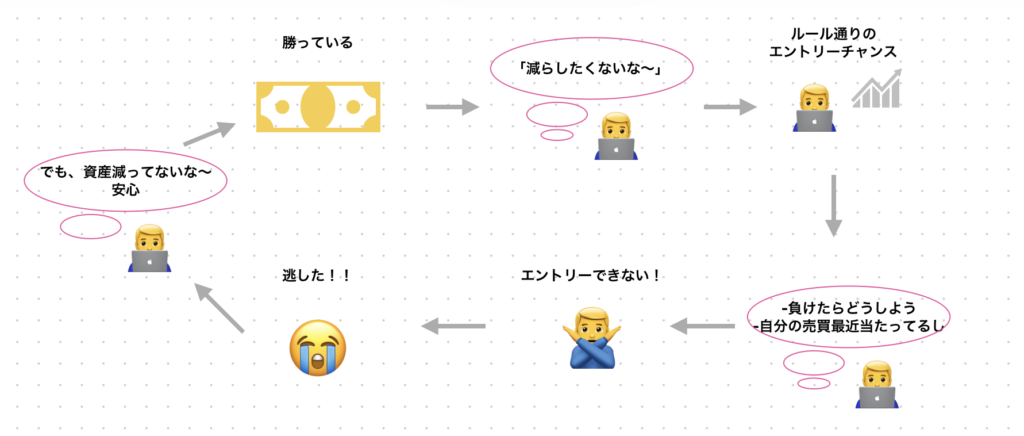 昨日の自分のメンタルはこの状態ですね。今月勝率8割で相当プラスになっているので、「減らしたくない」「自分はトレードがうまくなった。予想当たるぞ」みたいな確率と期待値以外を考えてましたね。
