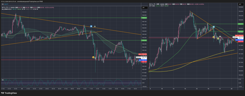 1時間の調整終わり、かつ5分の売り転換でMAタッチ。ルール通りで長期目線にも一致したいいトレードでした!